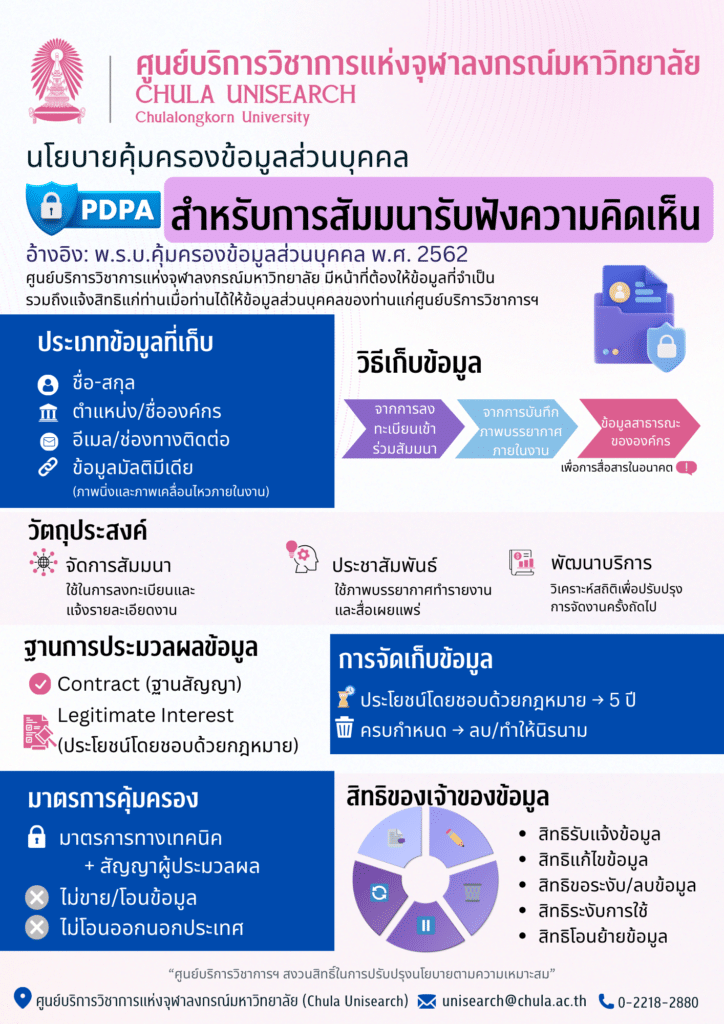 มั่นใจทุกการเรียนรู้และการมีส่วนร่วม ศูนย์บริการวิชาการฯ ให้ความสำคัญกับการคุ้มครองข้อมูลส่วนบุคคลของท่าน ตั้งแต่ขั้นตอนการลงทะเบียนไปจนถึงการสรุปผลกิจกรรม ไม่ว่าจะเป็นการสัมมนารับฟังความคิดเห็นหรือการอบรมวิชาการ