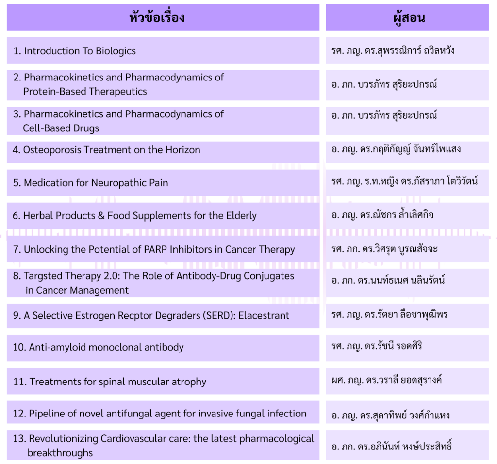 ในโลกยุคปัจจุบันที่มีวิทยาการทางการแพทย์ที่ก้าวล้ำและคนส่วนใหญ่หันมาใส่ใจในเรื่องการดูแลสุขภาพมากขึ้น ประชากรส่วนใหญ่ยังคงได้รับผลกระทบจากการเป็นโรคที่เกี่ยวข้องกับระบบภูมิคุ้มกัน โรคมะเร็ง โรคกระดูกพรุน และโรคข้อเสื่อม บริษัทยาและอุตสาหกรรมเทคโนโลยีชีวภาพยังคงพัฒนาวิจัยเพื่อหาการรักษาใหม่สำหรับโรคกลุ่มนี้ เทคโนโลยีใหม่ๆ เช่น ยาที่มีพื้นฐานมาจากโปรตีนหรือเซลล์ได้ถูกนำมาใช้ประโยชน์ ในรายวิชานี้ผู้เข้ารับการอบรมจะได้เรียนรู้เกี่ยวกับกลไกการเกิดโรคและการออกฤทธิ์ของยาใหม่ โดยมุ่งเน้นที่ให้ความรู้ใหม่เกี่ยวกับยาชีววัตถุ ยาโรคกระดูกและข้อ สมุนไพรและอาหารเสริมที่มีฤทธิ์ต่อระบบกล้ามเนื้อ และยารักษามะเร็ง