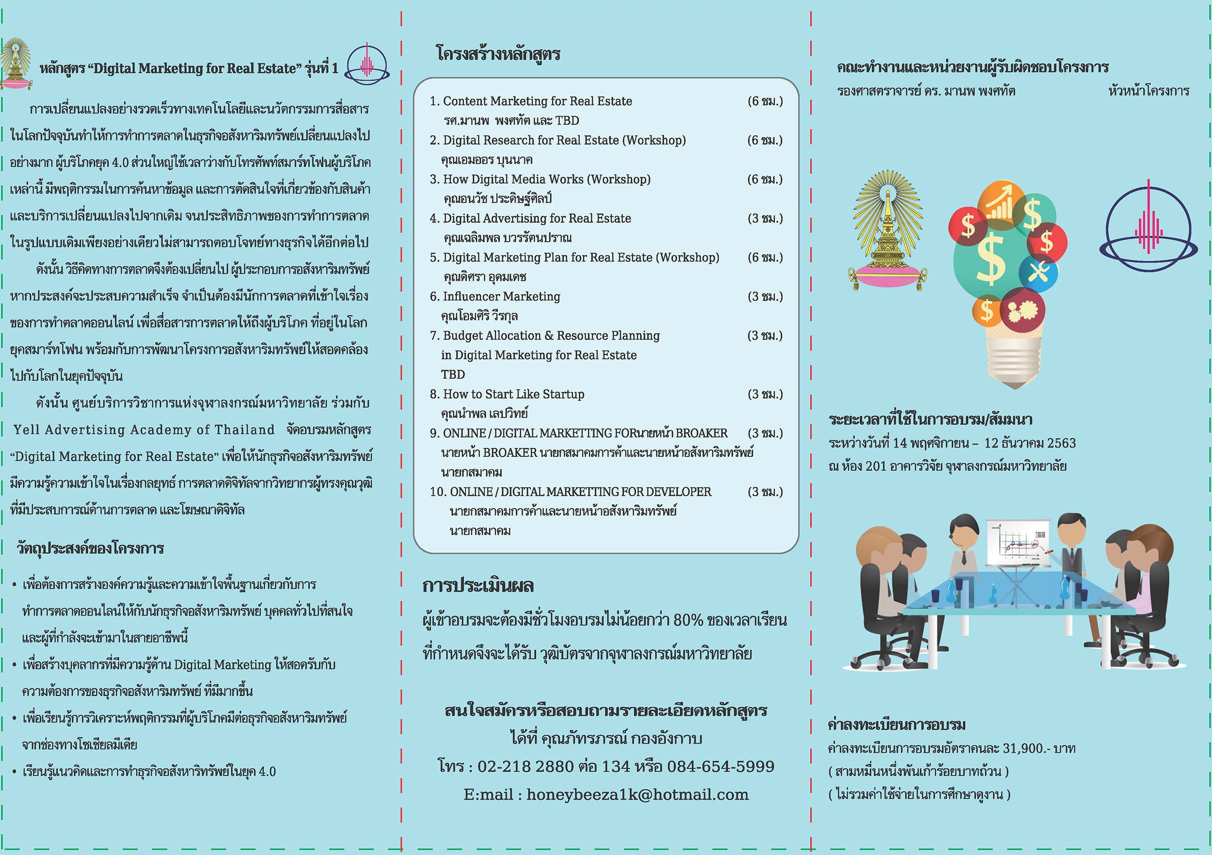 Yell Advertising Academy of Thailand ร่วมกับ ศูนย์บริการวิชาการแห่งจุฬาลงกรณ์มหาวิทยาลัย กำหนดจัดการฝึกอบรมหลักสูตร “Digital Marketing for Real Estate” รุ่นที่ 1 ขึ้นระหว่างวันที่ 14 พฤศจิกายน 2563 จนถึงวันที่ 12 ธันวาคม 2563 ณ ห้อง 201 อาคารวิจัยจุฬาลงกรณ์มหาวิทยาลัย โดยมีวัตถุประสงค์เพื่อสร้างองค์ความรู้และความเข้าใจพื้นฐานเกี่ยวกับการทำการตลาดออนไลน์ การวิเคราะห์พฤติกรรมที่ผู้บริโภคมีต่อธุรกิจอสังหาริมทรัพย์จากช่องทางโซเชียลมีเดีย รวมถึงแนวคิดและการทำธุรกิจอสังหาริมทรัพย์ในยุค 4.0 ให้แก่ผู้ประกอบการอสังหาริมทรัพย์ และผู้ที่สนใจ ได้มีความรู้ด้าน Digital Marketing ที่สอดรับกับความต้องการของธุรกิจอสังหาริมทรัพย์ ทั้งนี้ ผู้ที่สนใจสามารถสมัครและและสอบถามรายละเอียดเพิ่มเติมได้ที่ คุณภัทรภรณ์ กองอังกาบ หมายเลขโทรศัพท์ 0-2218-2880 ต่อ 133-134 หรือ 08-4654-5999 หรืออีเมล์ This email address is being protected from spambots. You need JavaScript enabled to view it. ได้ตั้งแต่บัดนี้เป็นต้นไป