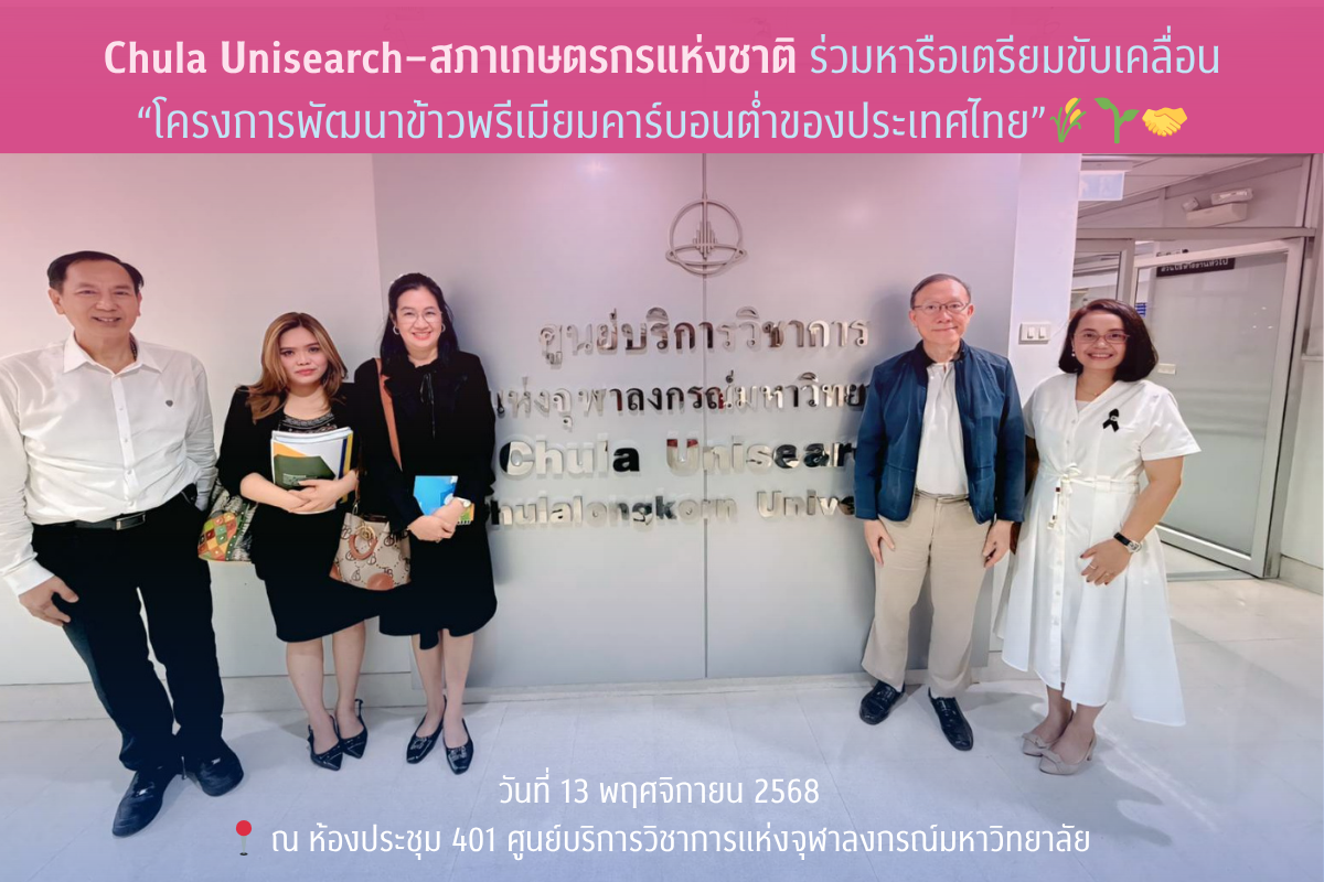 ศูนย์บริการวิชาการแห่งจุฬาลงกรณ์มหาวิทยาลัย จัดการประชุมหารือร่วมกับสภาเกษตรกรแห่งชาติ เพื่อเตรียมความพร้อมในการดำเนินงาน “โครงการพัฒนาข้าวพรีเมียมคาร์บอนต่ำของประเทศไทย” โดยมีผู้แทนจากทั้งสองหน่วยงานเข้าร่วมแลกเปลี่ยนข้อมูลและวางกรอบการทำงานอย่างรอบด้าน ในวันพฤหัสบดีที่ 13 พฤศจิกายน 2568 ณ ห้องประชุม 401 ศูนย์บริการวิชาการแห่งจุฬาลงกรณ์มหาวิทยาลัย