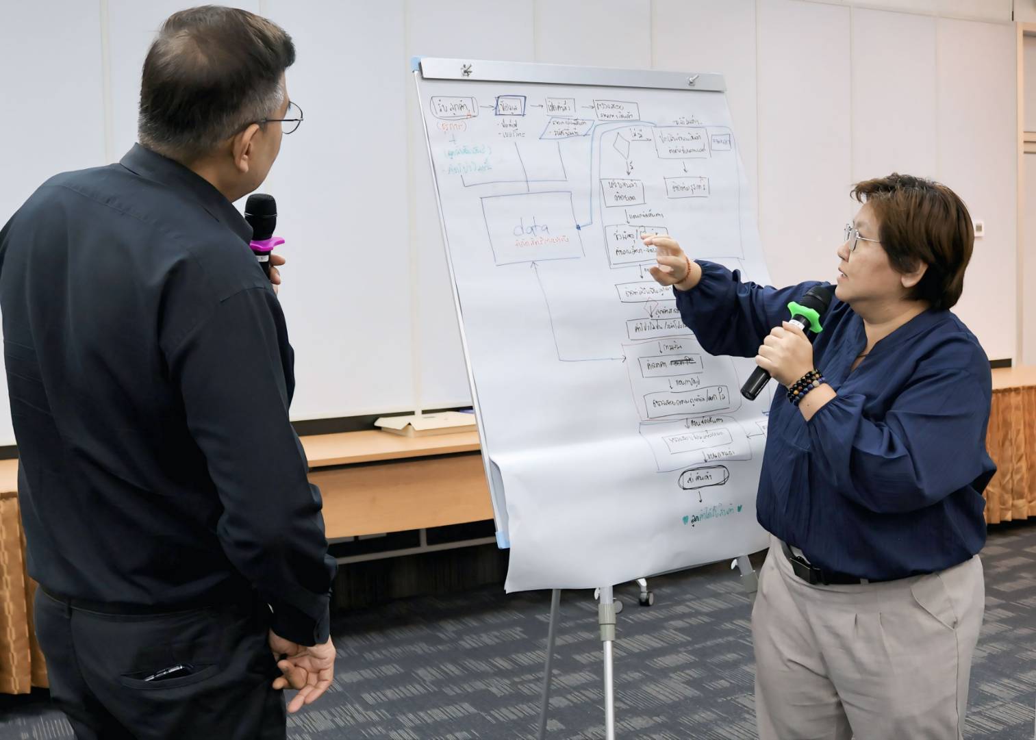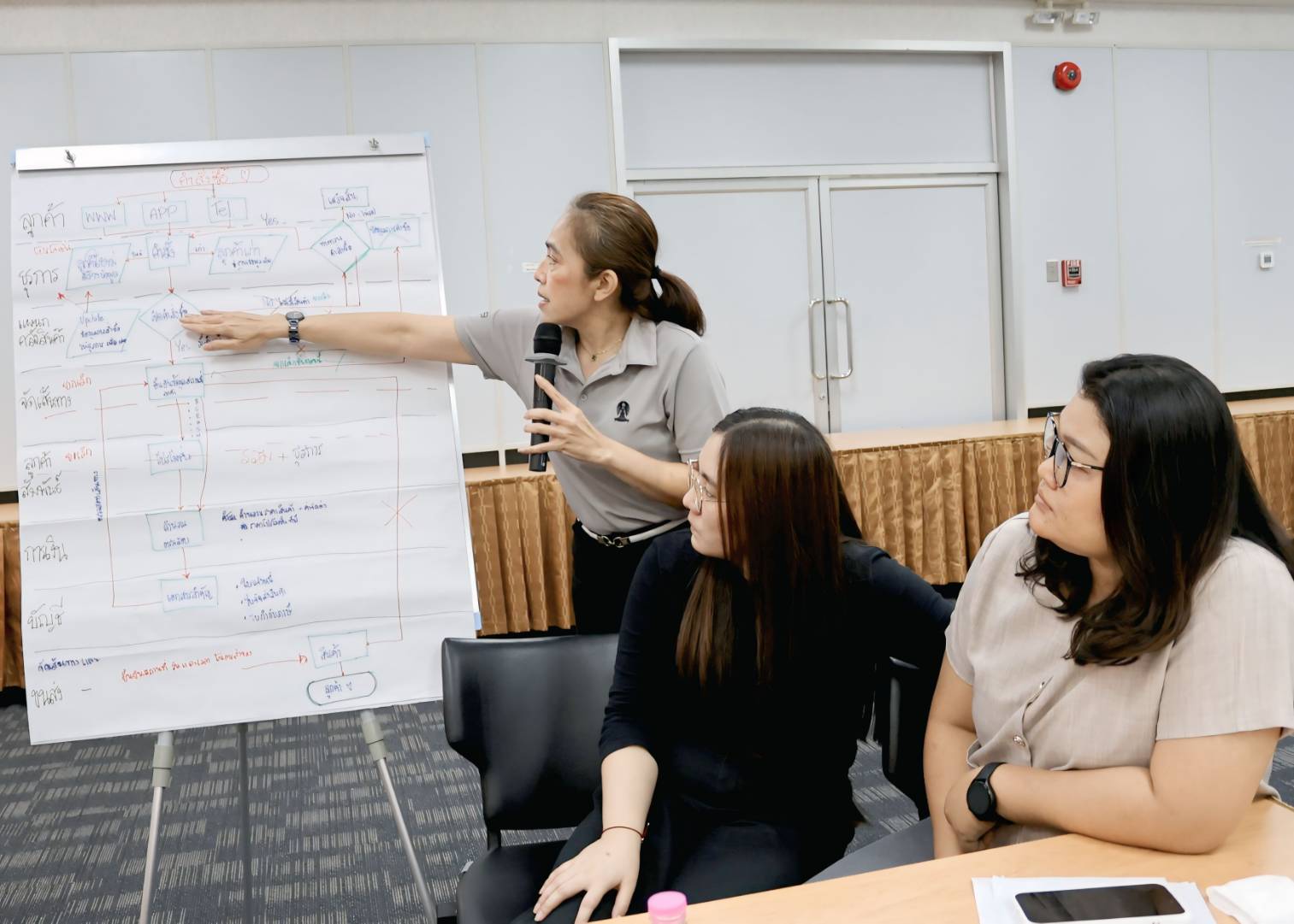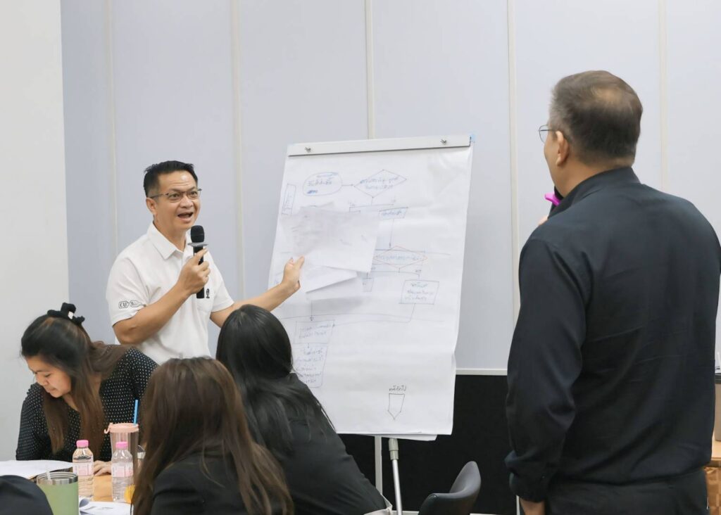 ซึ่งเป็นกรณีศึกษาที่ใกล้เคียงกับการดำเนินงานในองค์กรจริง ผู้เข้าอบรมได้ร่วมกันวิเคราะห์กระบวนการทำงานตั้งแต่ต้นน้ำถึงปลายน้ำ ระบุจุดซ้ำซ้อน จุดคอขวด และปัญหาที่อาจเกิดขึ้น เพื่อฝึกทักษะการมองกระบวนการอย่างเป็นระบบและมีเหตุผล