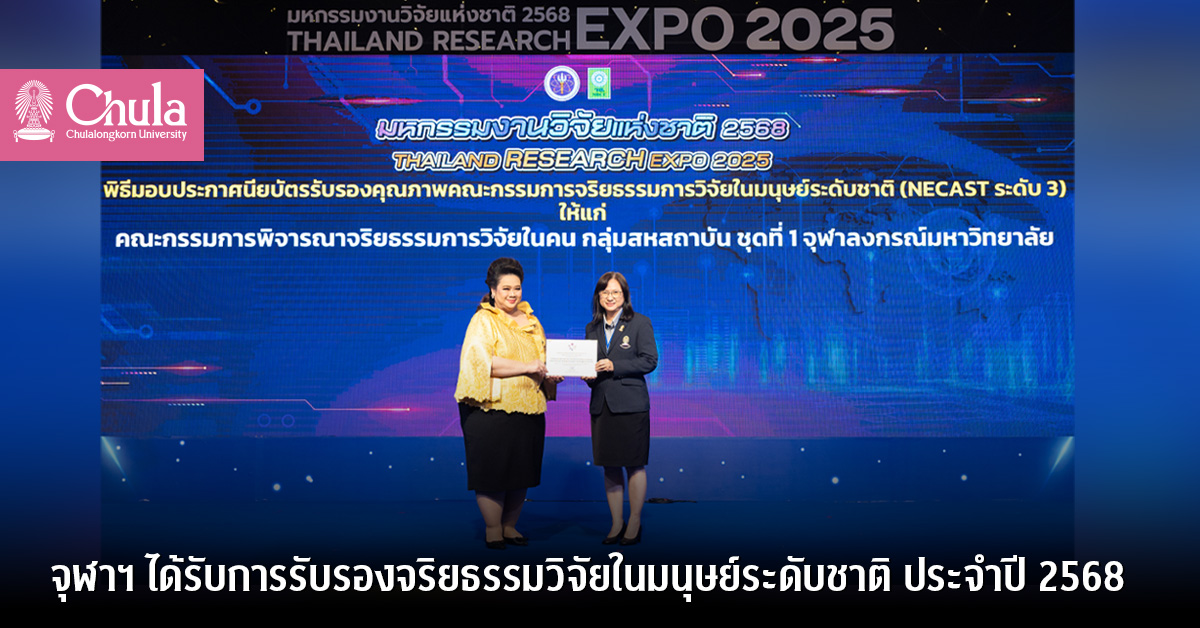 จุฬาลงกรณ์มหาวิทยาลัยได้รับประกาศนียบัตรรับรองคุณภาพคณะกรรมการจริยธรรมวิจัยในมนุษย์ระดับชาติ (NECAST ระดับ 3) เมื่อวันที่ 16 มิถุนายน 2568 ณ ห้อง World Ballroom ชั้น 23 โรงแรมเซ็นทาราแกรนด์และบางกอกคอนเวนชันเซ็นเตอร์ เซ็นทรัลเวิลด์ ในพิธีเปิดงาน “มหกรรมงานวิจัยแห่งชาติ 2568” (Thailand Research Expo 2025) โดยมีคุณศุภมาส อิศรภักดี รัฐมนตรีว่าการกระทรวงการอุดมศึกษา วิทยาศาสตร์ วิจัยและนวัตกรรม เป็นประธานในพิธี และมอบประกาศนียบัตรคณะกรรมการจริยธรรมวิจัยในมนุษย์ระดับชาติ (NECAST) พร้อมปาฐกถาพิเศษ เรื่อง “Research for All: พลิกโฉมอนาคตไทยด้วยวิทยาศาสตร์ วิจัย และนวัตกรรม”
