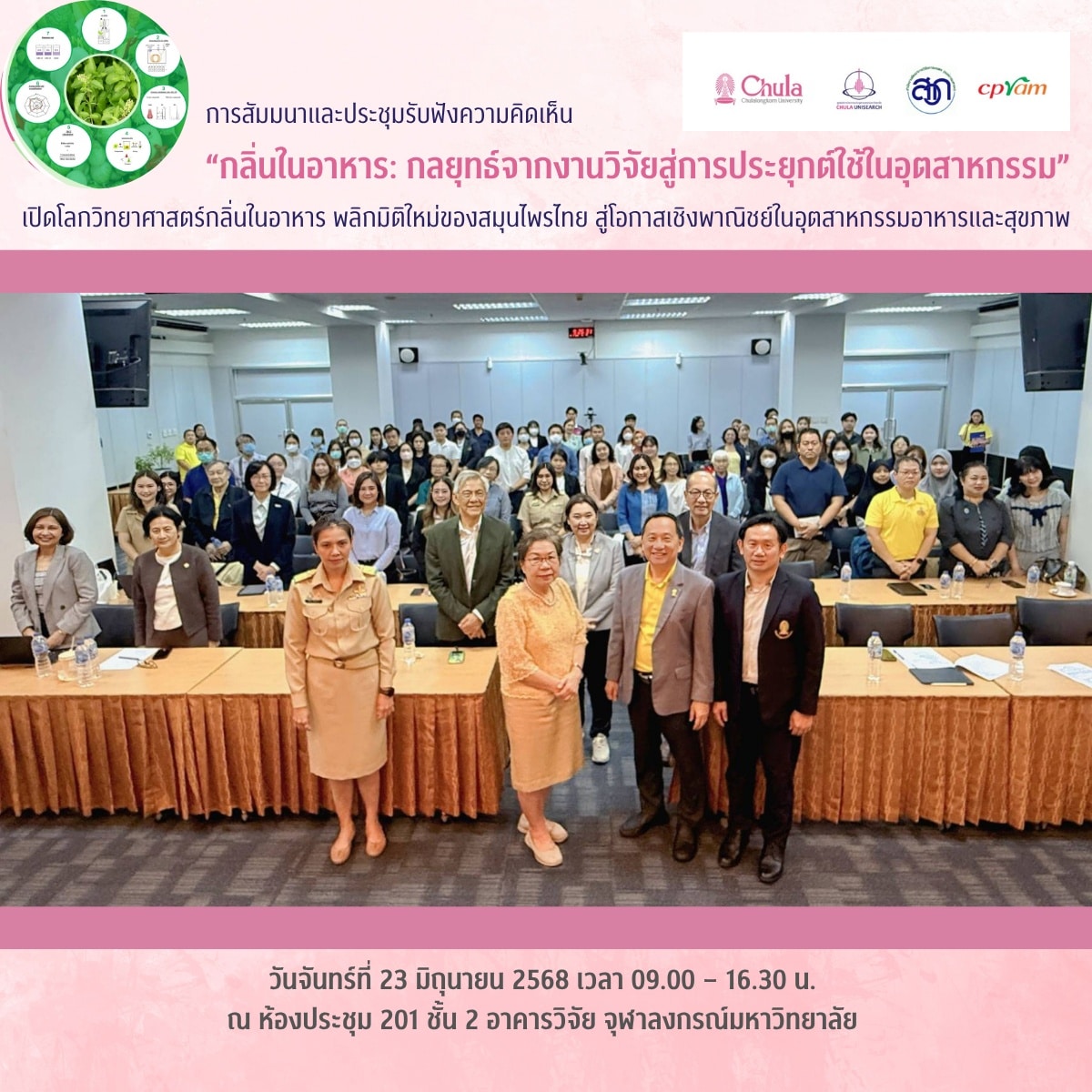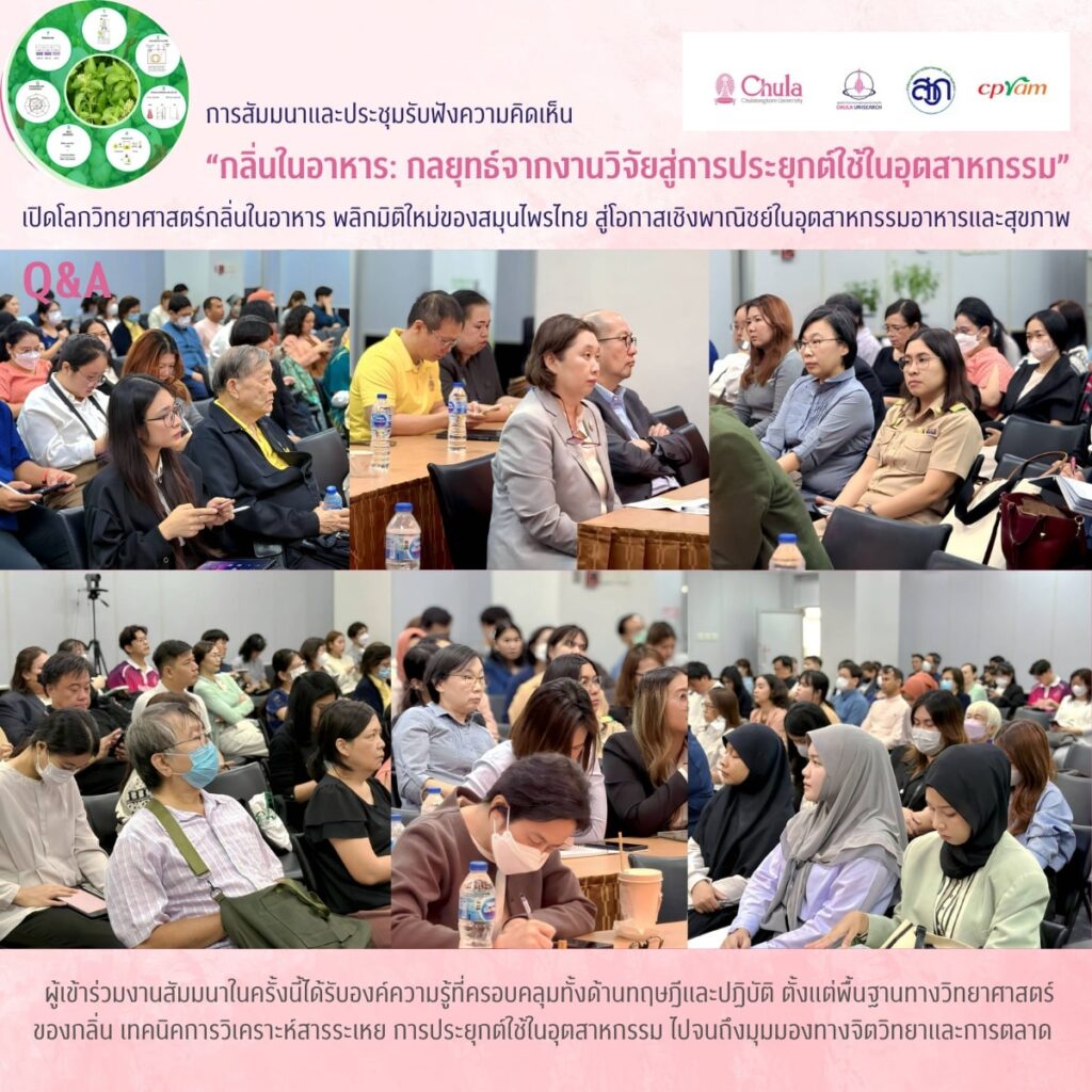 ศูนย์บริการวิชาการแห่งจุฬาลงกรณ์มหาวิทยาลัย ร่วมกับ สำนักงานพัฒนาการวิจัยการเกษตร (องค์การมหาชน) (สวก.) บริษัท ซีพีแรม จำกัด (CPRAM) และ Molecular Sensory Science Lab จุฬาลงกรณ์มหาวิทยาลัย ได้จัดงานสัมมนาวิชาการในหัวข้อ “กลิ่นในอาหาร: กลยุทธ์จากงานวิจัยสู่การประยุกต์ใช้ในอุตสาหกรรม” เมื่อวันจันทร์ที่ 23 มิถุนายน 2568 เวลา 09.00 – 16.30 น. ณ ห้องประชุม 201 ชั้น 2 อาคารวิจัย จุฬาลงกรณ์มหาวิทยาลัย ซึ่งจัดขึ้นภายใต้โครงการวิจัยเรื่องการศึกษาสารให้กลิ่นที่สำคัญในใบกะเพราสดและผลิตภัณฑ์ เพื่อใช้ในการควบคุมคุณภาพ การสัมมนานี้ได้รับความสนใจจากผู้เข้าร่วมงานทั้งในรูปแบบ Onsite และ Online รวมจำนวนกว่า 300 คน โดยมีวัตถุประสงค์เพื่อเผยแพร่ความรู้ด้านวิทยาศาสตร์ของกลิ่นในอาหาร และเปิดเวทีแลกเปลี่ยนองค์ความรู้ระหว่างนักวิจัย นักวิชาการ และผู้ประกอบการในอุตสาหกรรมอาหาร