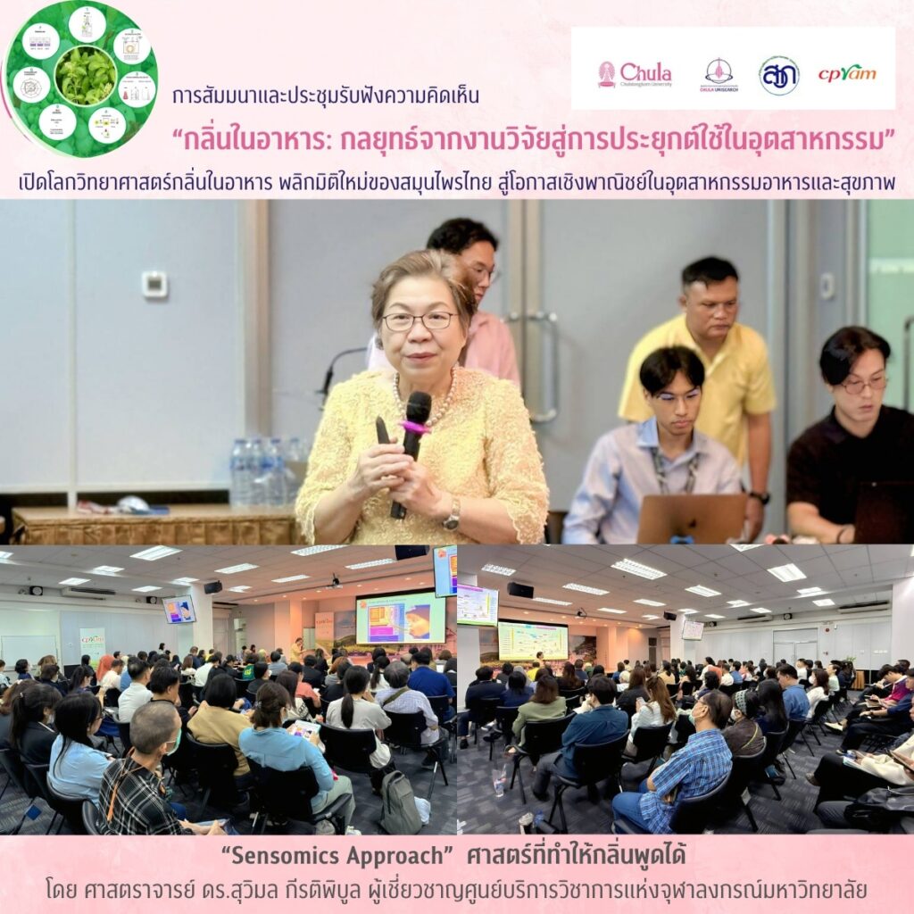 ในช่วงเช้าของงานประกอบด้วย กิจกรรมการบรรยายเพื่อถ่ายทอดความรู้จากผู้ทรงคุณวุฒิหลากหลายสาขา โดยเริ่มจาก ศาสตราจารย์ ดร.สุวิมล กีรติพิบูล ผู้เชี่ยวชาญศูนย์บริการวิชาการแห่งจุฬาลงกรณ์มหาวิทยาลัย นำเสนอถึงการประยุกต์ใช้เทคนิคกระบวนการทางเซนโซมิกซ์ในการศึกษาสารให้กลิ่นสำคัญของผลิตภัณฑ์อาหารและผลผลิตทางการเกษตร ซึ่งกลิ่นคือภาษาที่ซับซ้อนที่สุดของอาหาร การควบคุมกลิ่นจึงไม่ใช่แค่การรักษาคุณภาพ แต่คือการเล่าเรื่องราวของผลิตภัณฑ์ให้ผู้บริโภคได้รู้สึกรับรู้ – การใช้เทคนิค “Sensomics Approach” เป็นกระบวนการวิเคราะห์กลิ่นที่ผสานองค์ความรู้ทางเคมีของสารระเหยเข้ากับการรับรู้กลิ่นของมนุษย์ โดยใช้เครื่องมือทางวิทยาศาสตร์ เช่น SAFE, GC-O และ GC-MS เพื่อระบุสารให้กลิ่นสำคัญอย่างแม่นยำ รวมถึง ยังให้คำแนะนำซึ่งเป็นแนวทางแก้ไขในการปฏิบัติจริง