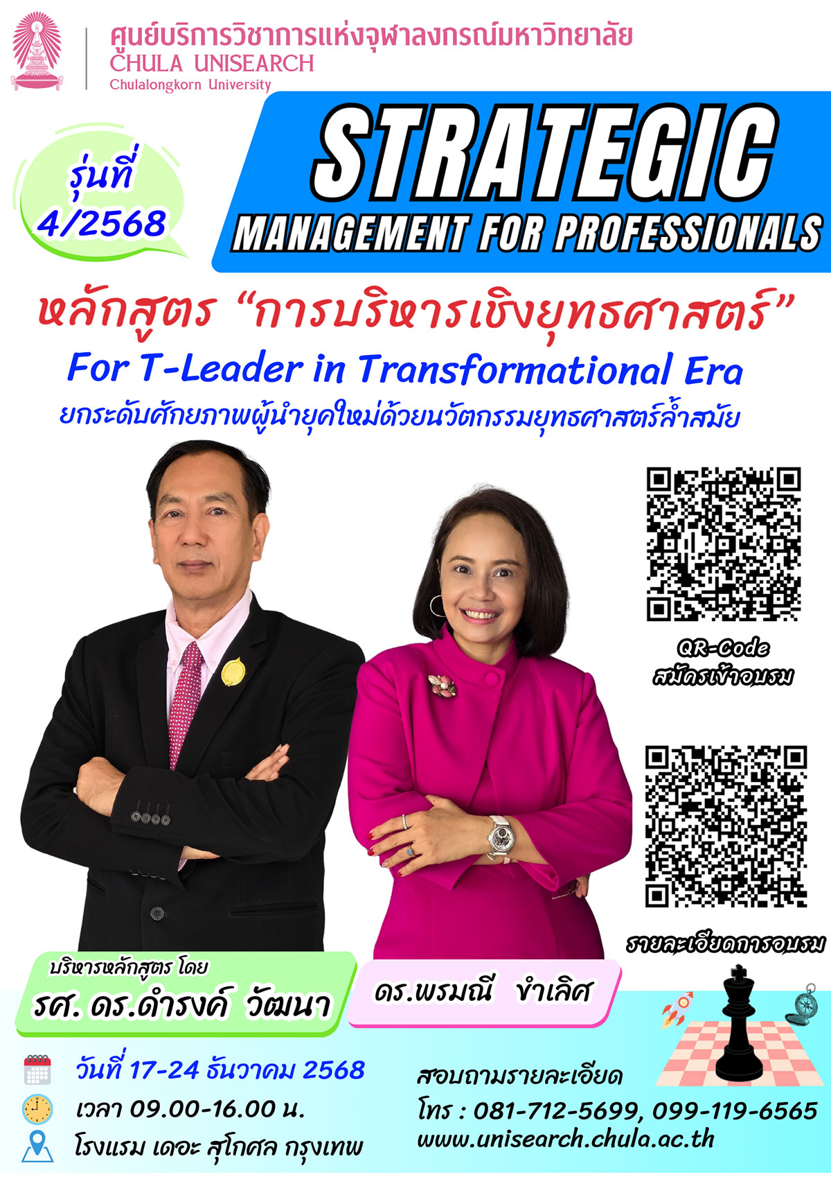 ศูนย์บริการวิชาการแห่งจุฬาลงกรณ์มหาวิทยาลัย (Chula Unisearch) จึงเปิดรับสมัครการฝึกอบรม หลักสูตร “การบริหารเชิงยุทธศาสตร์” (Strategic Management for Professionals) For T-Leader in Transformational Era รุ่นที่ 4 ประจำปี 2568