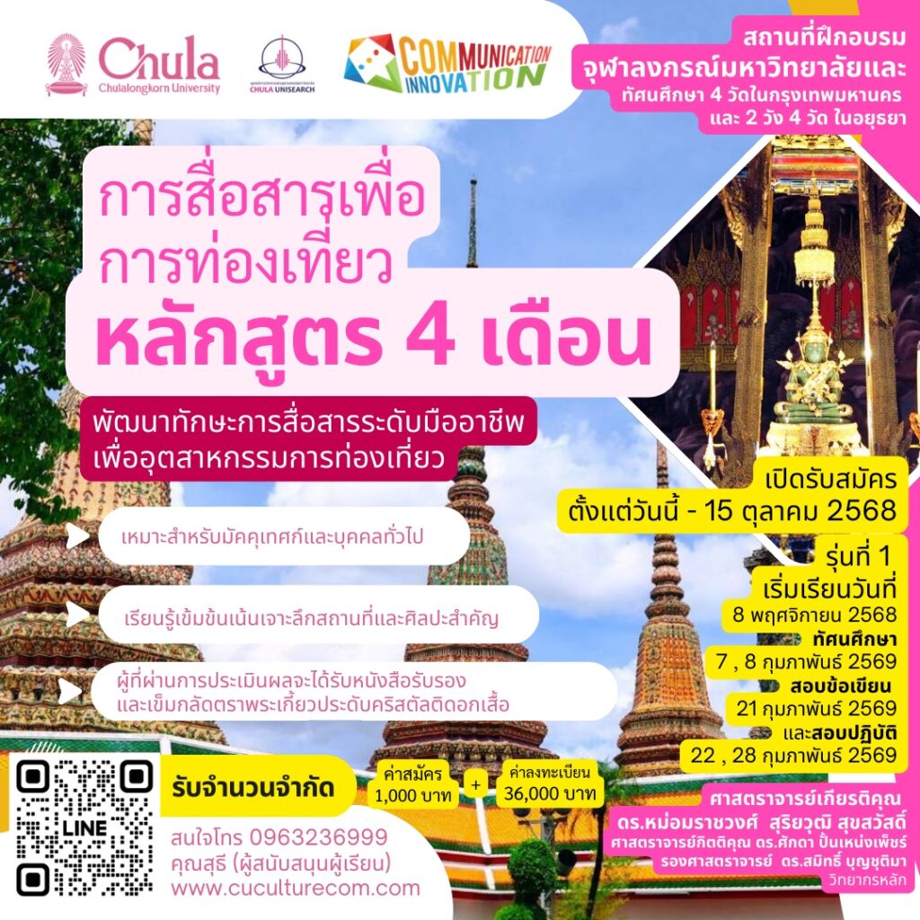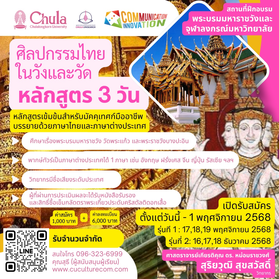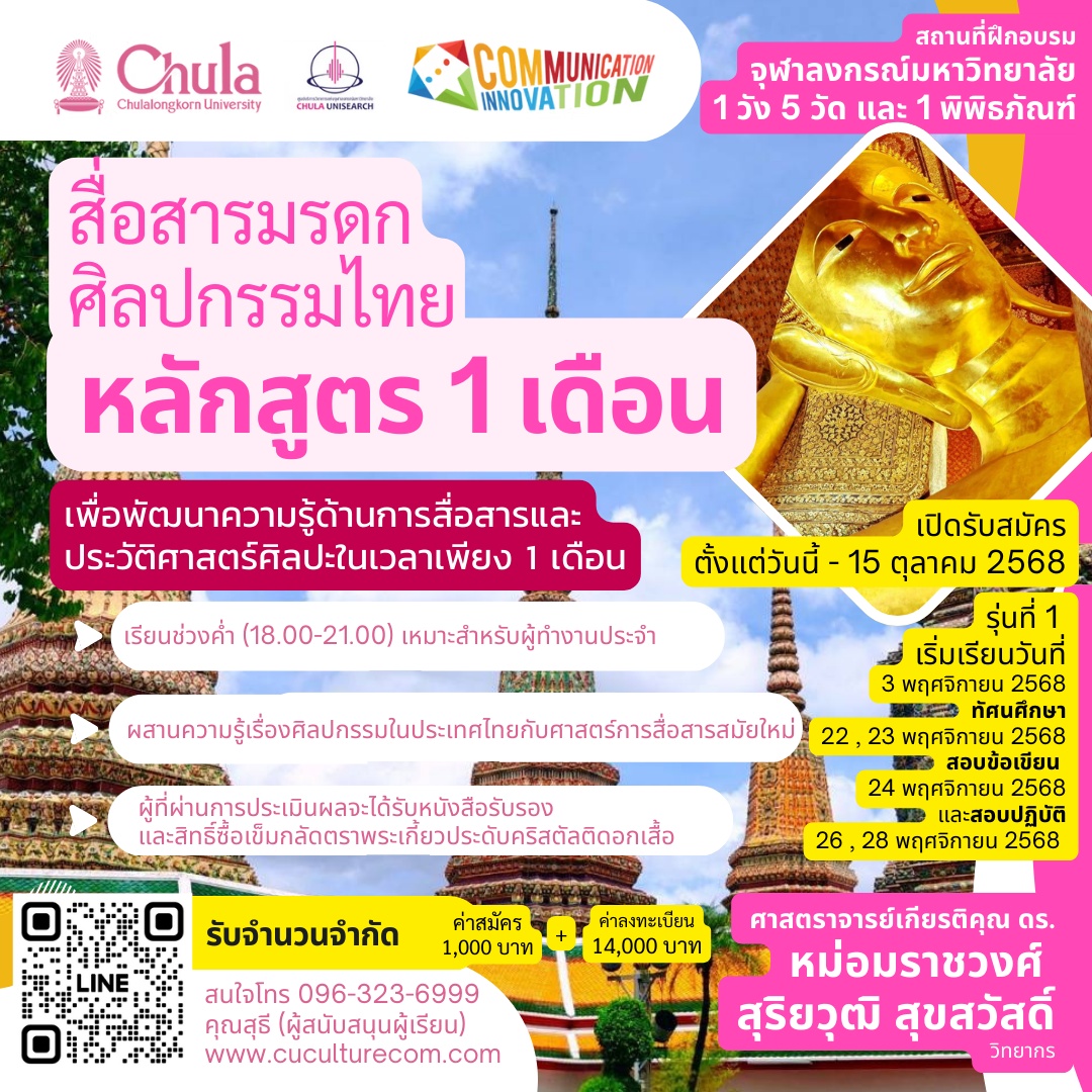 “CUCultureCom” เสริมทักษะสื่อสารวัฒนธรรมและมรดกศิลป์อย่างมืออาชีพจำนวนชั่วโมง: 6 ชั่วโมงจุฬาฯ เปิด 4 หลักสูตรการสื่อสารและศิลปกรรมไทย “CUCultureCom” เสริมทักษะสื่อสารวัฒนธรรมและมรดกศิลป์อย่างมืออาชีพ