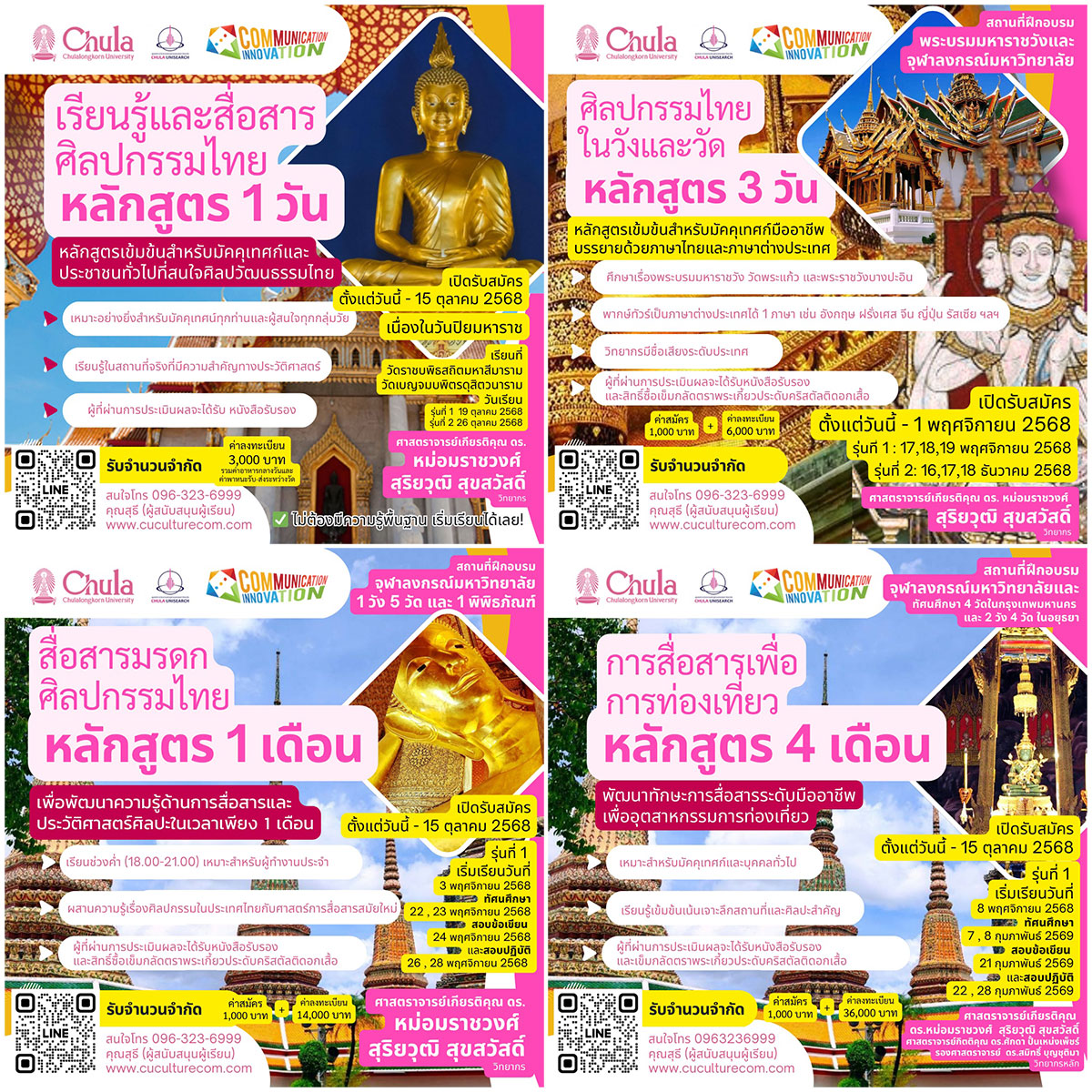 จุฬาลงกรณ์มหาวิทยาลัย โดยศูนย์เชี่ยวชาญเฉพาะทางด้านนวัตกรรมการสื่อสาร (Communication Innovation) ภาควิชาการประชาสัมพันธ์ คณะนิเทศศาสตร์ จุฬาลงกรณ์มหาวิทยาลัย ร่วมกับศูนย์บริการวิชาการแห่งจุฬาลงกรณ์มหาวิทยาลัย (Chula Unisearch) เปิดโอกาสให้ผู้สนใจด้านการสื่อสาร วัฒนธรรม และศิลปกรรม เข้าร่วมอบรมในโครงการ CUCultureCom – 4 หลักสูตรแห่งการเรียนรู้เพื่อเสริมสร้างความเข้าใจและทักษะการสื่อสารศิลปวัฒนธรรมไทยอย่างลึกซึ้ง